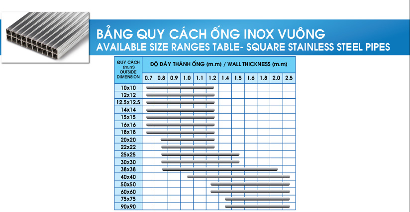 Quy cách ống inox trang trí vuông